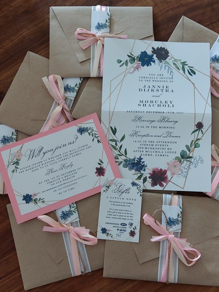 EN. You joining us on our wedding, whether physical or ONLINE, is the GREATEST GIFT of all. If it is your wish to BLESS US WITH A PERSONAL GIFT to help us on the way, a little cash to spend on our mutual new home, would really make our day. When you live in Zambia, you can do that through mobile money. When you live in any other country please send a personal message so I can give you the correct bankdetails. THANKS SO MUCH IN ADVANCE FOR YOUR GIFT!!!!